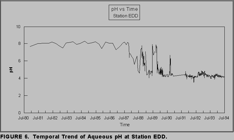 Station EDD monitors flow from Station EMO about 300 m upstream (Figure 1) and from local catchments on the north and east sides of the Outslopes. The trend of pH through time shows a sharp decrease in late 1987, from around 8 to almost 6 (Figure 6), when the EMO ditch was connected to the EDD ditch. In early 1988, the first acidic pH (less than 6.0) was detected. By mid 1988, pH recovered, but began a trend of fluctuation until stabilizing near pH 4.0 in late 1990.