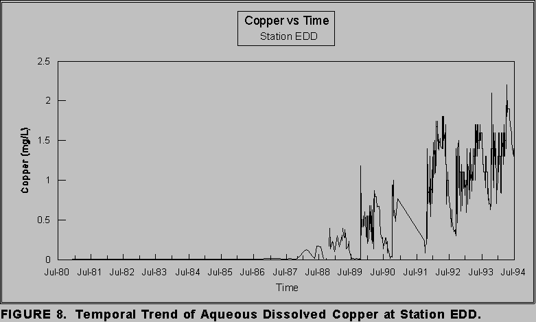 Although pH first showed an acidic value in late 1988, sulphate concentrations produced a sharp increase in mid 1986 by a factor of two and again in mid 1987 by another factor of two (Figure 7). As a result, sulphate provided a warning period of about two years before acidic pH was first measured. This observation is consistent with the observations at Station NDD. Metals such as copper (Figure 8) responded to pH fluctuations due to the correlation between these two parameters.