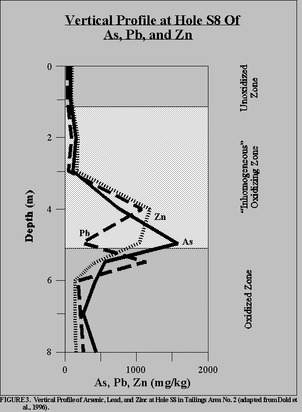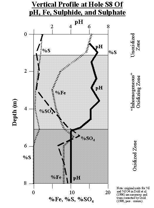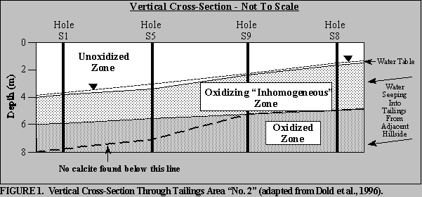 Dold et al. (1996) thought that the precipitation of secondary minerals was clogging porespaces and rendering the deeper tailings impermeable, causing inflowing seepage to flow through the tailings at increasingly higher elevations through time. As a result, the inhomogeneous and oxidized zones were migrating upwards through time into the unoxidized zone and, in effect, eventually oxidizing the entire tailings profile.